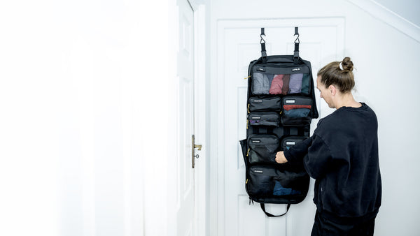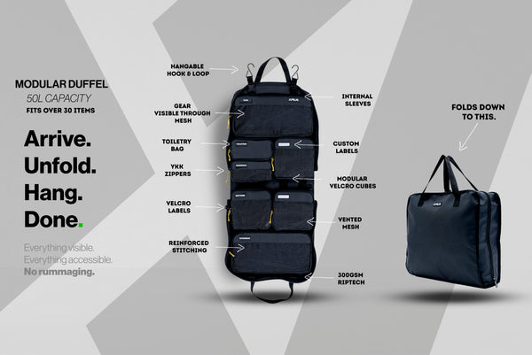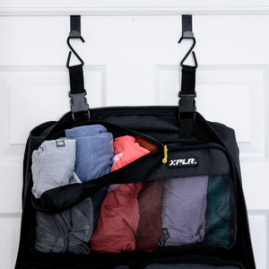 The XPLR™ DUFFEL unfolds into a mobile wardrobe.you can hang anywhere.Your car, camp, or cabin. No more digging through bags,